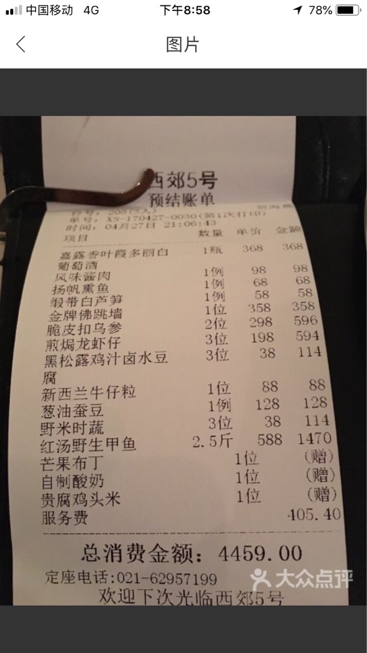 昨日下午三点,新民晚报新民网记者来到位于虹古路669号的西郊5号餐厅。当记者询问工作人员是否知晓网上“天价账单”情况时,几位工作人员均表示他们并没有注意到网上信息,同时表示负责人不在店里。也有工作人员在看过网传收银条后透露,店里人均消费在800-1000元。