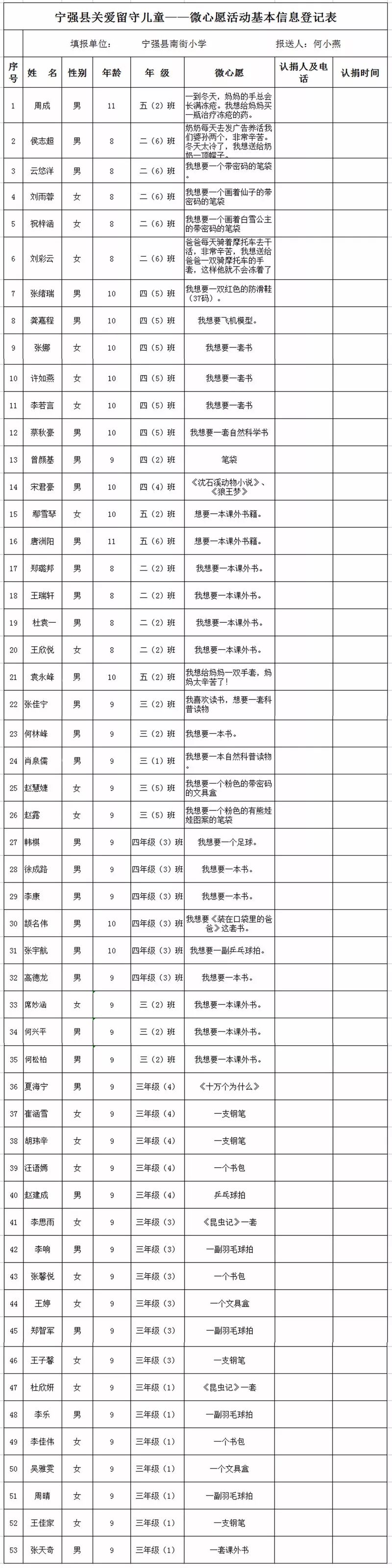 远离父母的呵护 害怕孤独 害怕别离 渴望陪伴 渴望亲情 渴望拥有七彩缤纷的童年 渴望看见世界的一束光 据调查,中国农村“留守儿童”数量超过5800万人,不完全统计,汉中地区留守儿童约10万人。近期,港闸区秦灶街道团工委将联合宁强县开展关爱留守儿童——微爱圆梦微活动,你愿意奉献一份微爱,圆孩子们的一个微心愿吗? 一到冬天,妈妈的手总会长满冻疮。我想给妈妈买一瓶治疗冻疮的药。 奶奶每天去发广告养活我们婆孙两个,非常辛苦。冬天太冷了,我想送给奶奶一顶帽子。 爸爸每天骑着摩托车去干活,非常辛苦,我想送给爸爸一双骑摩托车的手套,这样他就不会冻着了。 我想要一个画着白雪公主的带密码的笔袋。 我想要一本课外书。 我想给妈妈一双手套,妈妈太辛苦了! 我喜欢读书,想要一套科普读物。 我想要《装在口袋里的爸爸》这套书。 … …. 小小的微心愿,承载着孩子们对父母的牵挂,寄托着七彩的童年梦想,一本书,一个足球,一双手套,一件棉衣都可以给孩子们送去关爱,温暖他们孤独的内心,点亮他们前行的道路,让我们共同伸出援助之手,让孩子们在阳光下成长。 圆梦行动联系人:石宁 联系电话:85668074
