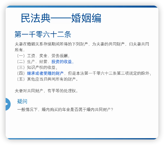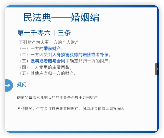 几个月前,我很喜欢单口喜剧演员黄阿丽离婚!全球网友们感叹:恭喜姐姐脱离废柴老公,独自美丽! 其实,在他们14年结婚的时候,因为男方家境优越,黄阿丽被迫签订婚前协议,这样就将她和她老公的财产完全分隔开来。没想到的是,在这之后,黄阿丽的事业迅速腾飞,成了全家的经济支柱。那份曾经是被迫签订的婚前协议,却帮她保全了自己的财产。 如今离婚率越来越高,不论是像我这样的单身女性,还是我们父母一辈,在我们结婚之前都会担心:万一我们离婚了,婚前财产是不是会白白分给了男方呢? 虽说我们可以跟黄阿丽老公一样,跟对方签订婚前协议,但是这种事情,不是所有人都说的出口的。搞不好还会严重影响夫妻感情。 细细品读民法典1062/1063条,就会明白这样的担心不无道理。今天讨论嫁妆,也就是父母在婚前的赠予财产,因此法条请重点关注1062(四)和 1063(三)。 如 1063(三)规定,父母也可以通过婚前的单方赠予协议来确定只归一方的财产。但在实操过程中,现金类资产在婚后很容易混同,最后在离婚时不得不进行分割。这个时候,其实可以用一个好用的工具:储蓄险。 我们来举个例子。 一个阿姨有100万现金,准备作为嫁妆给到快要结婚的女儿。如果这个阿姨直接把100万现金给到女儿,很可能出现婚后财产混同的情况,或者因为婚姻问题被分割。如果阿姨可以在女儿结婚前买一份年金保险,结果就会完全不同。 保险,是投保人和保险公司签订的具有法律效应的合同。在这个例子里面,阿姨是投保人,她可以通过年交20万,一共交5年的方式,购买这份100万保费的保险合同。 女儿是被保险人。她可以在合同规定的一段时间之后开始领钱。如果阿姨买的是一份期限为终生的年金,女儿就可以终生领钱,不管将来她的婚姻状况如何,她都可以持续地领到妈妈给到她的这份保险金。 对阿姨来说,她心里也会更踏实。 如果女儿离婚,由于这份保险的投保人是自己,这份财产也不会受到任何影响。如果将来女儿婚姻幸福,这笔钱可以作为小两口的日常补贴,就算阿姨之后去世,这份保单依然可以持续不断地给到女儿现金流的支持。最后,也是很重要的一点,因为这份保险是阿姨和保险公司之间签订的法律合同,所以完全不需要让男方知道!即规避了风险,又保证关系和睦。 因为投保人和被保险人在保险合同上写得清清楚楚,所以这份保单资产未来的走向,也就非常清楚了。再加上保单本身的条款设置,钱什么时候领,领多少,都是固定的。这样呢,就能,就进一步明确资产走向的具体时间、具体金额。这就是储蓄类年金最美妙的地方。 如果你有关于年金的问题,欢迎留言给我。 愿女孩们都拥有更全面的保证,更自由的人生。 8 Y4 L/ k; y8 W- k