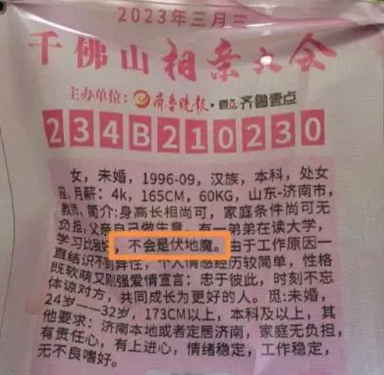 一些有弟弟的女生也怕相亲对象会介意,特别提前说明。一位96年的女生在个人信息牌中介绍道,自己有一个弟弟在读大学,学习比她好,并强调“自己不会是伏地魔(扶弟魔)”。