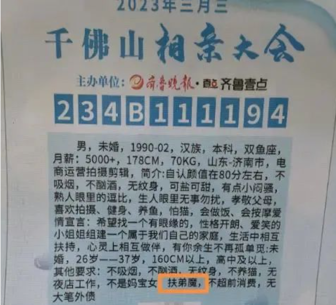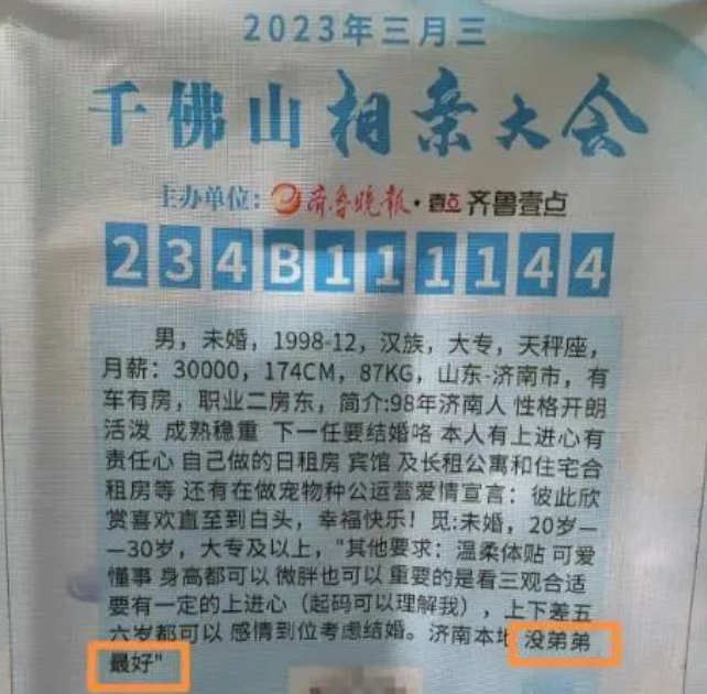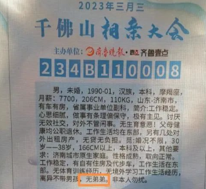 4月21日,山东济南千佛山相亲大会现场,记者注意到,要求女方不能有弟弟,写入了不少男生的择偶条件。