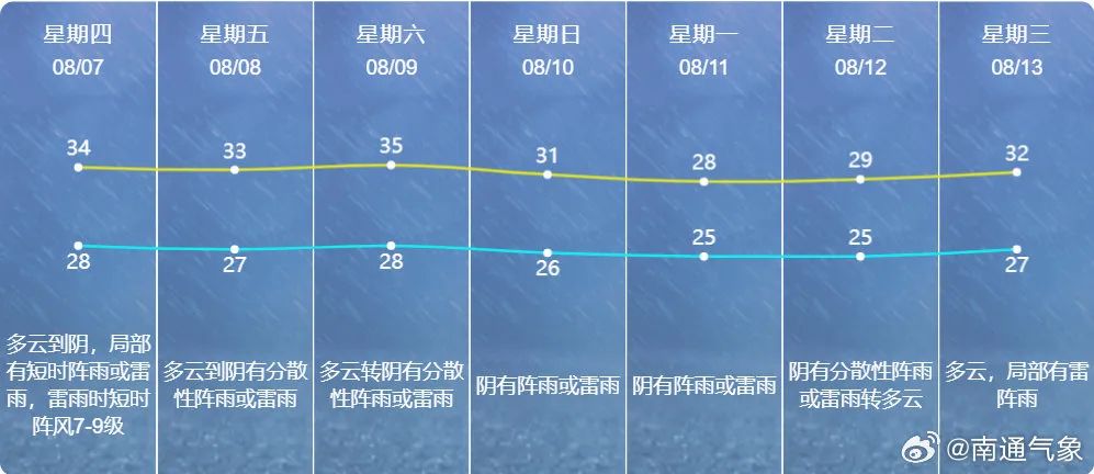 立秋当天,正值中伏末期。受高湿度影响,近期南通天气闷热难耐,体感温度较实际温度更高。从最新气象资料来看,未来几日我市仍维持着“多云+分散性阵雨或雷雨”的天气格局,最高气温维持在34℃左右,预计本周六将再次冲击35℃高温线。真正能带来降温的雨水可能得等到10日才会出现。