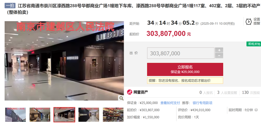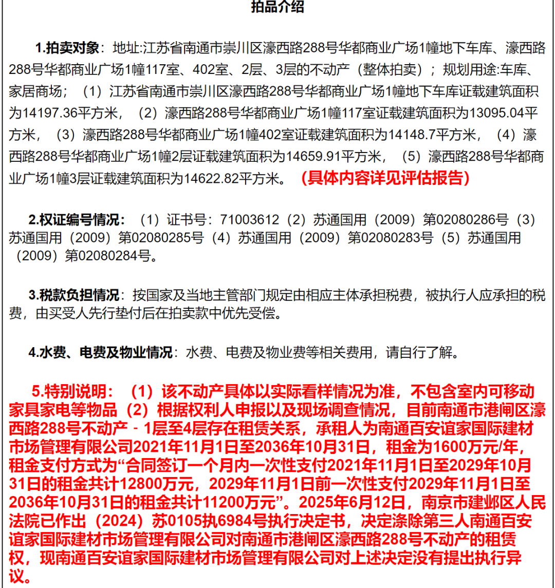 近日,阿里法拍平台上架一则重量级法拍信息,标的为江苏省南通市崇川区濠西路288号华都商业广场1幢地下车库、濠西路288号华都商业广场1幢117室、402室、2层、3层的不动产(整体拍卖),引发多人关注!