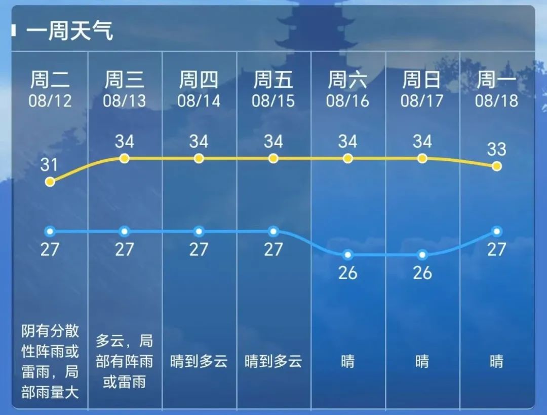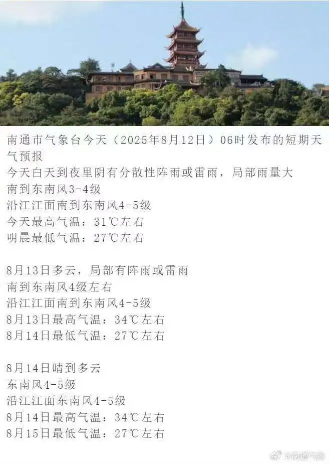 今天白天到夜里阴有分散性阵雨或雷雨,局部雨量大,最高气温:31℃左右,明晨最低气温:27℃左右 8月13日多云,局部有阵雨或雷雨,最高气温:34℃左右 8月14日晴到多云,最高气温:34℃左右 南通0 |