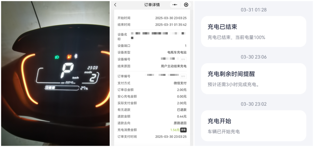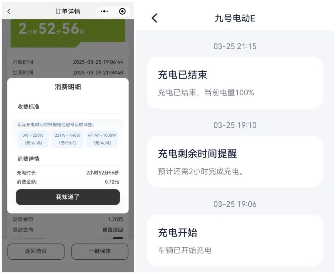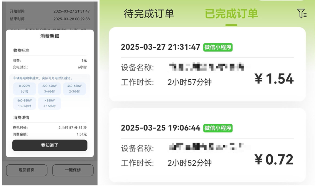 3月25日网友桩小盟小程序显示的收费标准及充电时长对比