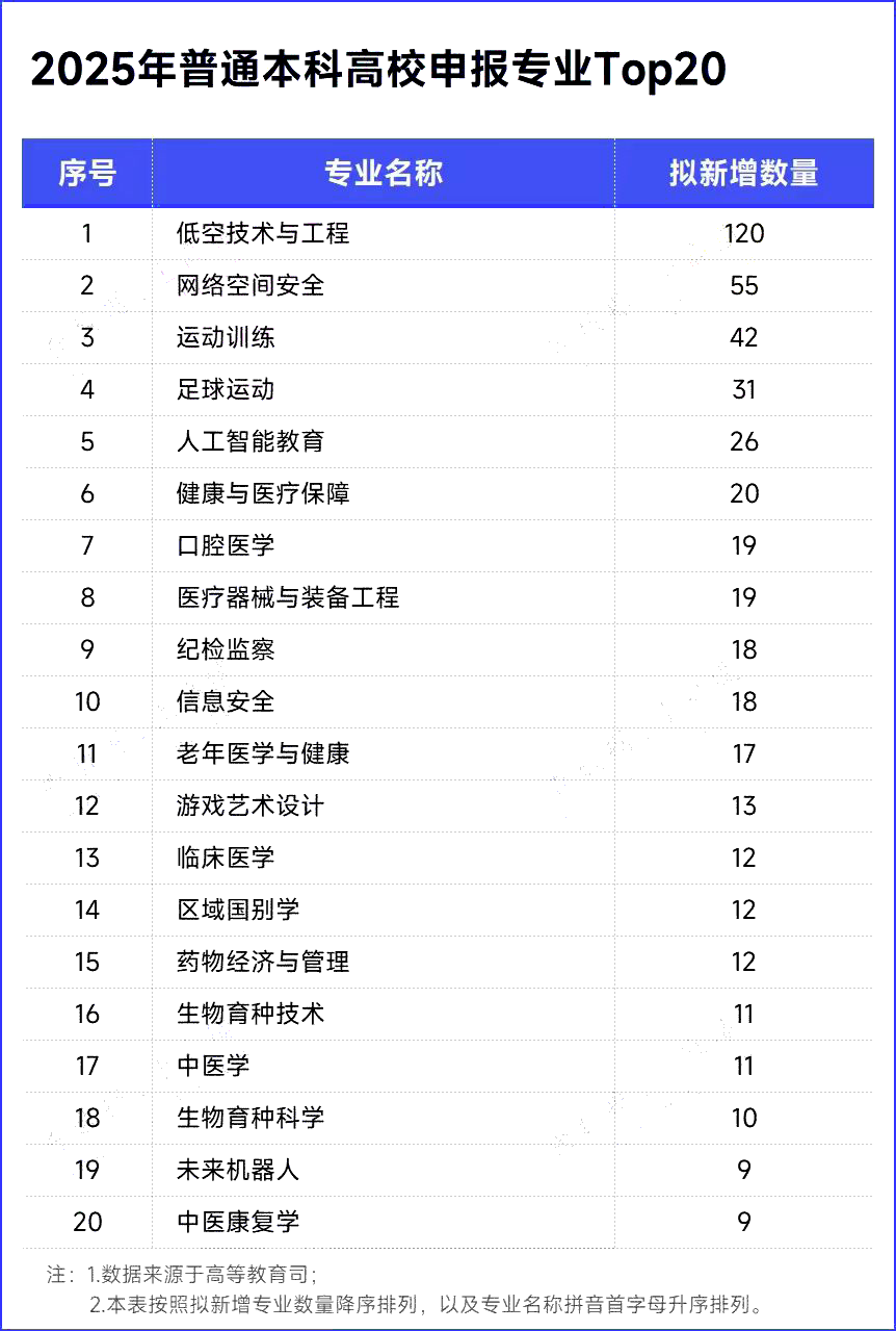 经统计,2025年度全国普通高校共申报本科专业239种,拟新增专业863个。其中,低空技术与工程专业拟新增120个,数量最多;网络空间安全专业次之,拟新增55个。 公示显示,江苏共有南京大学、东南大学等35所普通高校申报新增专业59个,涉及专业40种。其中南通大学新增运动训练、足球运动、智慧能源工程专业,南通理工学院新增低空技术与工程专业。