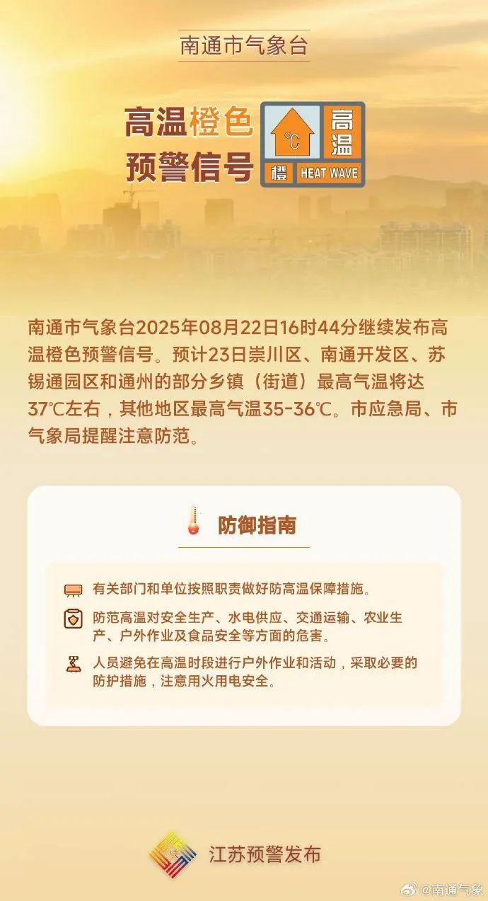 预计23日崇川区、南通开发区、苏锡通园区和通州的部分乡镇(街道)最高气温将达37℃左右,其他地区最高气温35-36℃。市应急局、市气象局提醒注意防范。