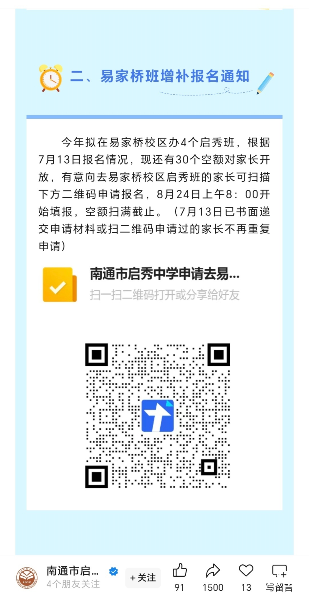 新初一启秀易家桥四个班还有30个名额,明天8点可线上报名